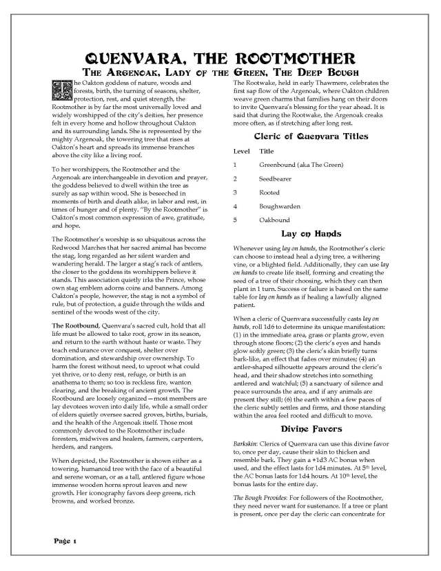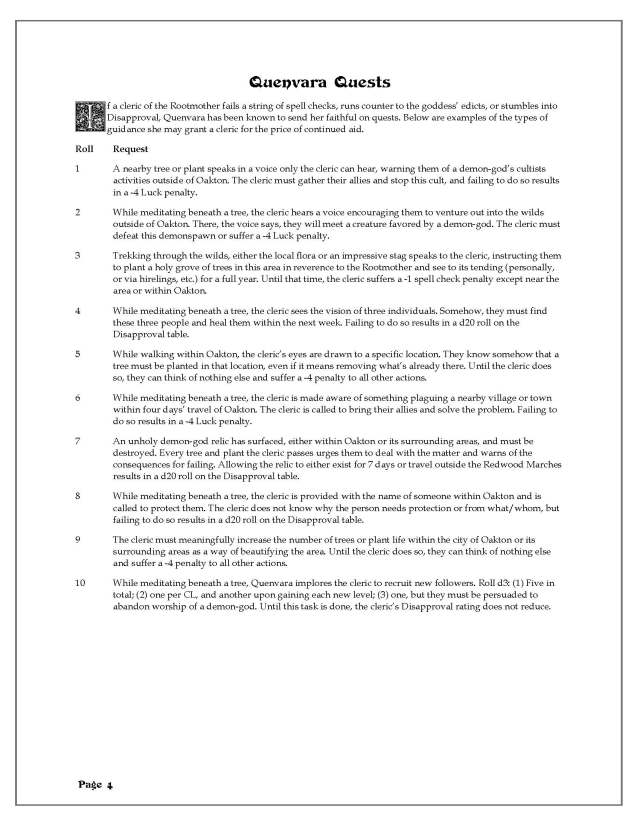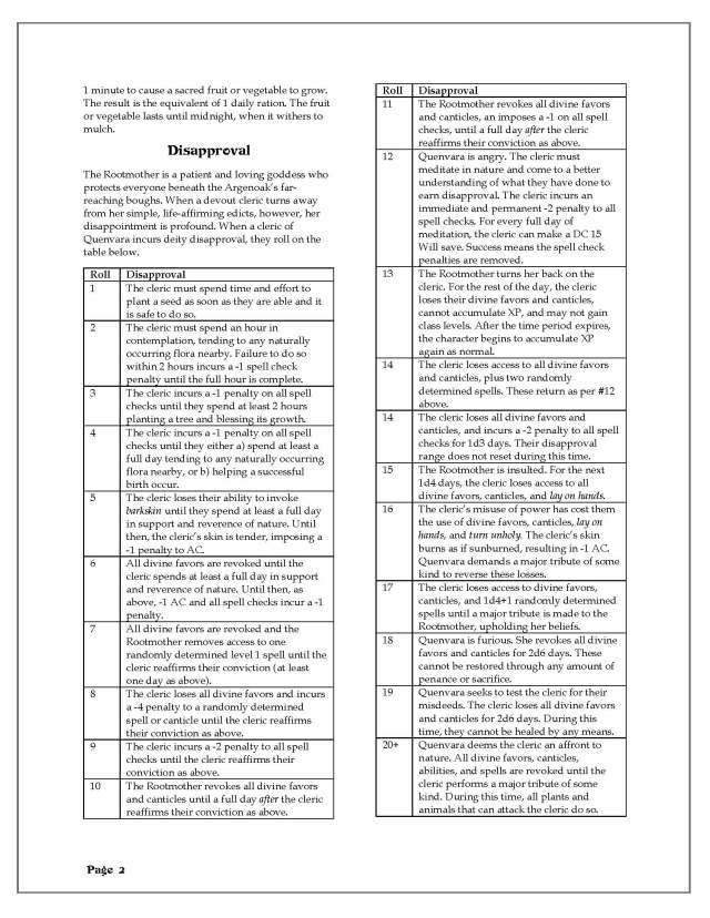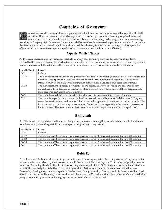 It’s fun to think about a cleric of Quenvara and wizard of Quenvara both leveling up and evolving over the course of a long campaign. The cleric would be continually steered towards the Rootmother’s edicts, sent on quests to promote her ideals and working to maintain her favor. In doing so, the cleric would have tons of healing and protection magic at their disposal. The wizard, meanwhile, would be slowly twisting and mutating over time, becoming something like an Ent from Tolkien or treant from Dungeons & Dragons, a living embodiment of Quenvara’s wishes without the strict need to uphold her ideals. Both paths are brimming with story potential, which is one of the reasons I love DCC so much.
