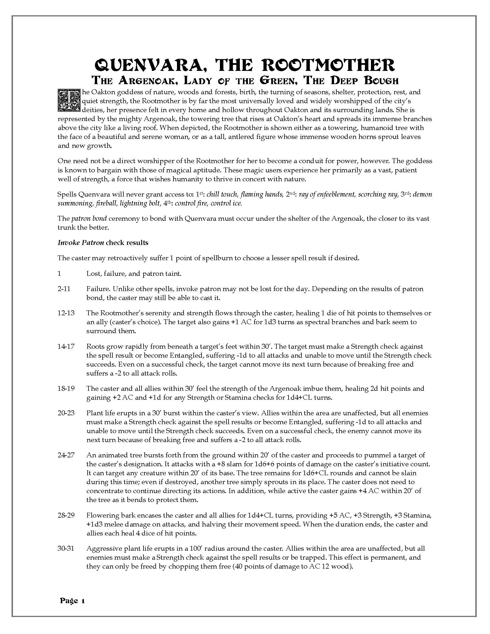 Last week, I asserted that any of my Law-promoting city-gods of Oakton and any of my Chaos-promoting demon-gods of the wilds could be either deities (i.e. provide clerics power) or patrons (i.e. provide wizards power), depending on the goals and aims of the human in relationship with them. To demonstrate how this relationship differs, I’ll look at the Rootmother as a patron. She’s so protective and human-loving… she wouldn’t corrupt a poor wizard, would she? By golly, she would!