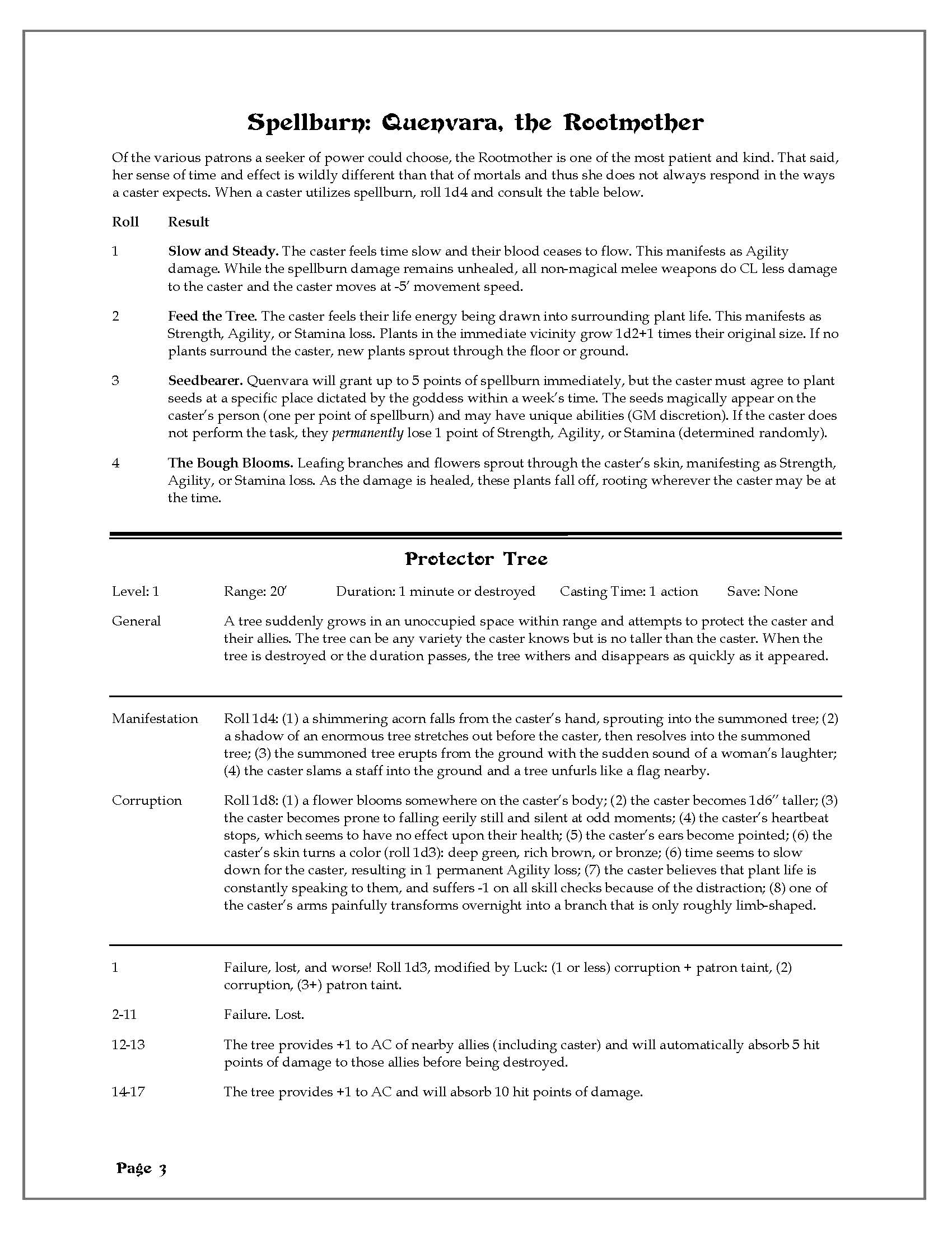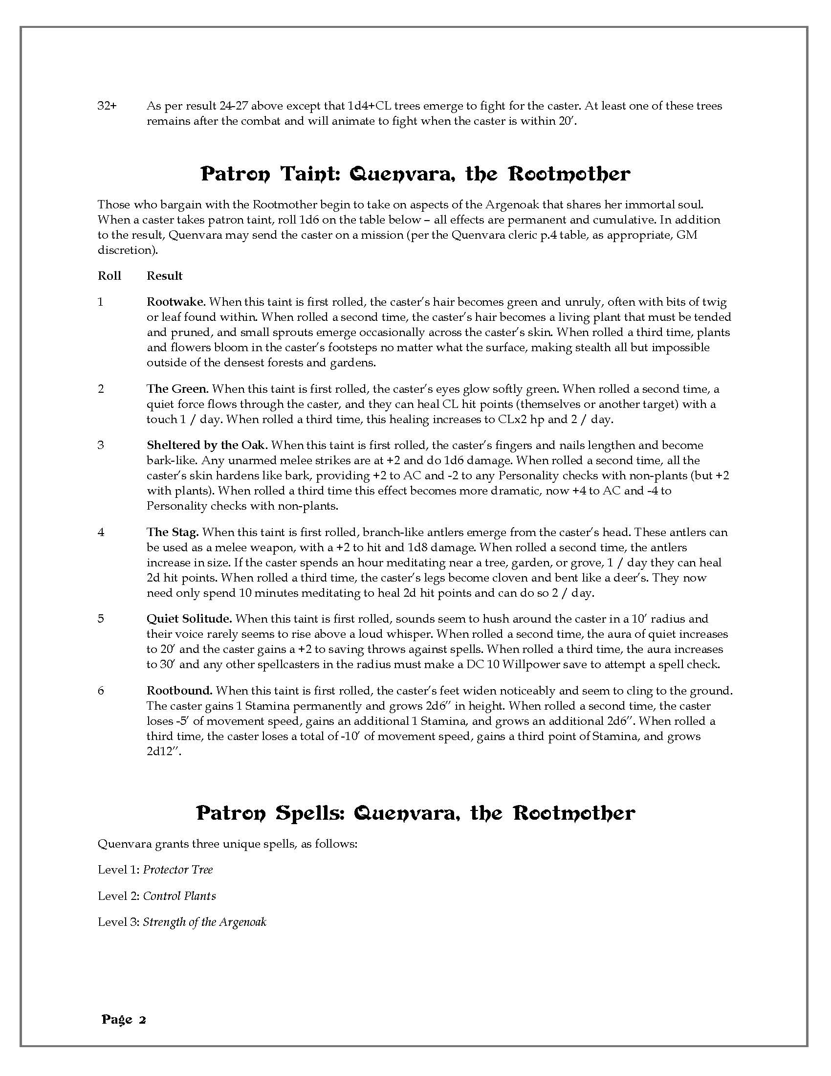 In my write-up for the Rootmother as a patron, I’ve relied heavily on Daniel J. Bishop’s Yddgrrl, the World Root expansion of the Invoke Patron spell in the DCC rulebook. I admit, I’m totally enamored with the Patron Taint and Corruption results for Quenvara, but I suspect that’s going to be true for every patron I write.