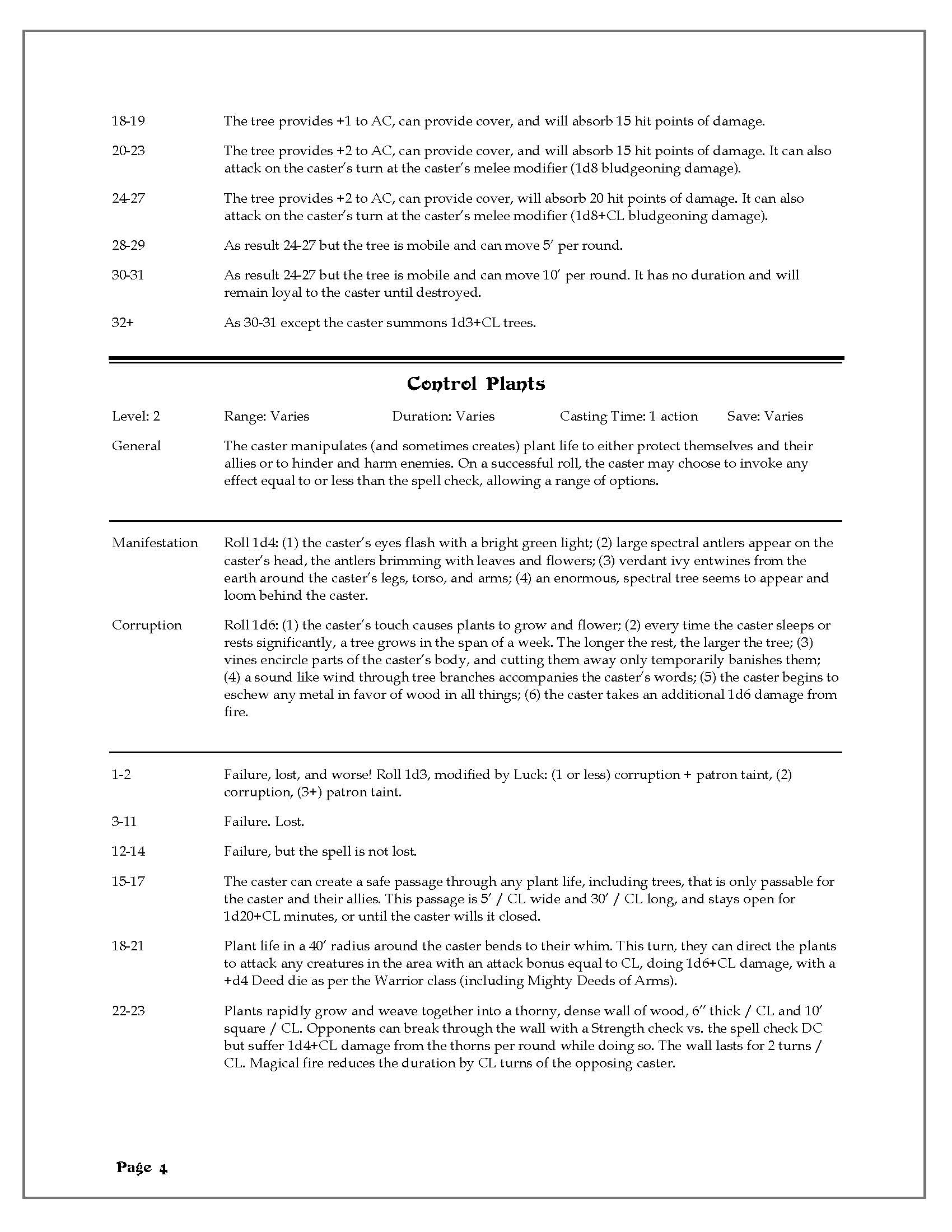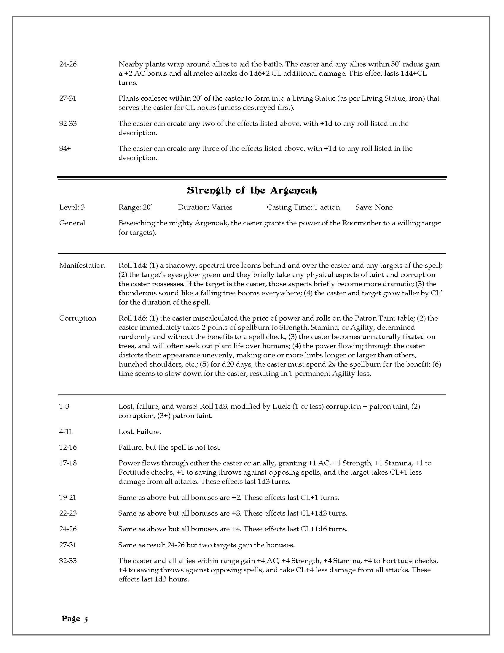 The hardest bits, at least for me, were the patron-specific spells, since DCC spells can get absolutely bonkers at higher spell check results. The “Control Plants” spell was the trickiest, and I stared at Control Fire and Control Cold for a long time to try and puzzle out its effects. You’ll also note that I expanded the “Failure, lost, and worse!” ranges for the spells, as one of my homebrew tweaks to DCC rules is saying that any spell check result in that spell’s level (i.e. 1-3 for a third-level spell) can result in patron taint and/or corruption. Otherwise, in my experience, both patron taint and corruption are too rare, and I don’t know a single wizard player who doesn’t revel in these tables.