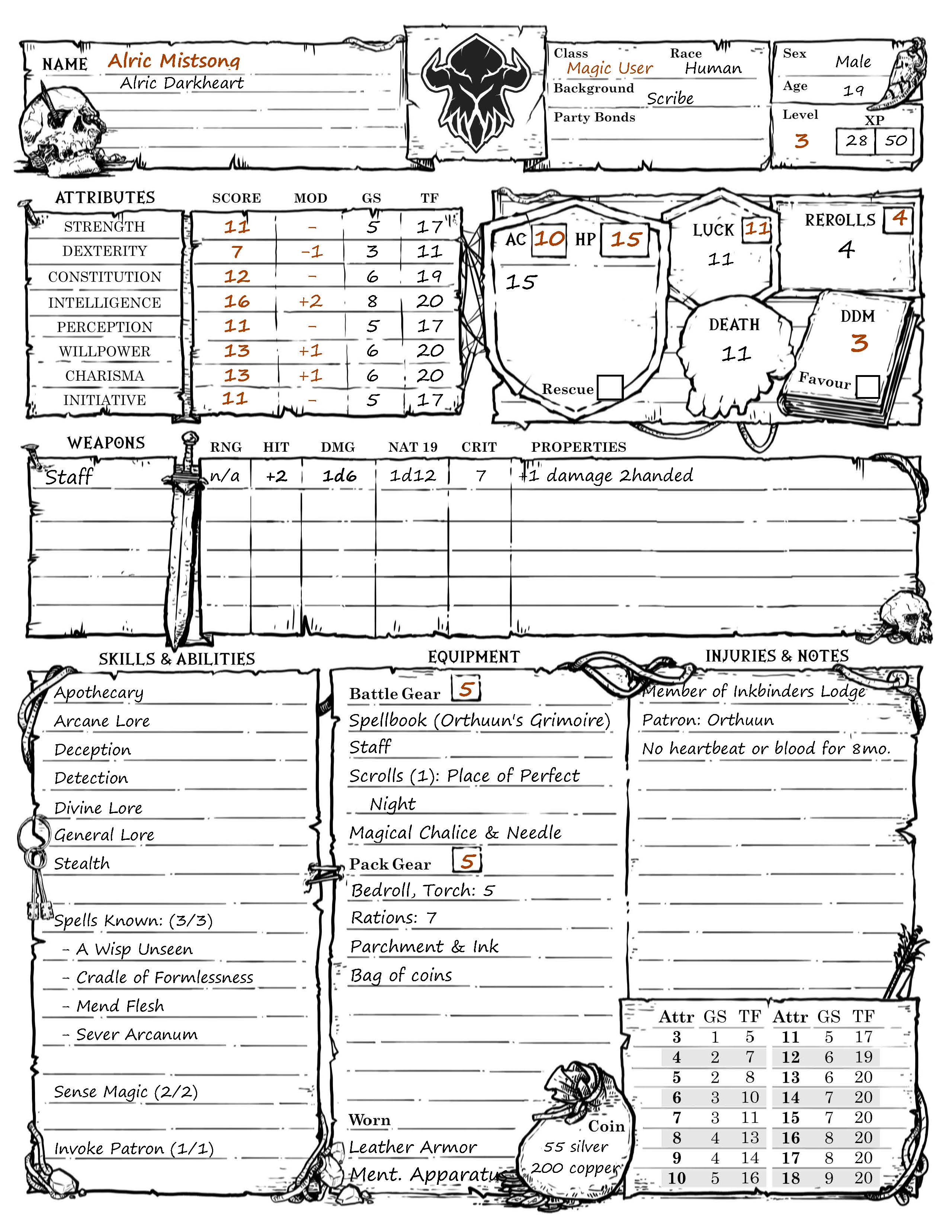 In terms of Hit Points, our Magic User moves from 14 maximum to… wait for it… 15! His Attack Bonus improves from +1 to +2 (that staff work paying off). Like his comrades, he now has 4 Rerolls available for the next adventure, which encourages me to put them in even more peril. Alric gains an extra spell use per day, now able to cast 3 total. He’ll also gain a new spell, and can choose from either of the scrolls he received in the Starless Rift: A Wisp Unseen (i.e. invisibility) or Place of Perfect Night (i.e. darkness). Since the latter hurts his party as much as his opponents, I’ll choose A Wisp Unseen, poetically the same spell he witnessed Hadren Kelthorn cast at the beginning of our second story. It’s arguably duplicative to Cradle of Formlessness (which he has yet to cast!) in terms of a “get out now” or infiltration spell, but I still like it from an Orthuun-themed perspective.