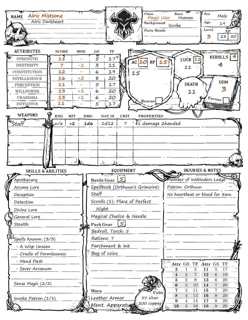 Before we get into Downtime, let’s recall what PCs get when the level up in Tales of Argosa. First, they receive +1 to an Attribute of their choice, excluding Luck and Initiative, up to 16. For Alric, I considered a few different options—namely Strength, Constitution, and Willpower, all of which would have made some sense from his arduous adventures. But, when it comes down to it, he’s hungry for knowledge and is going to spend this Downtime delving into the Lodge’s forbidden archives and advancing his own magical repertoire. His Intelligence is currently 15, so it makes the most sense to increase it to a maximum (for advancement purposes) to 16.