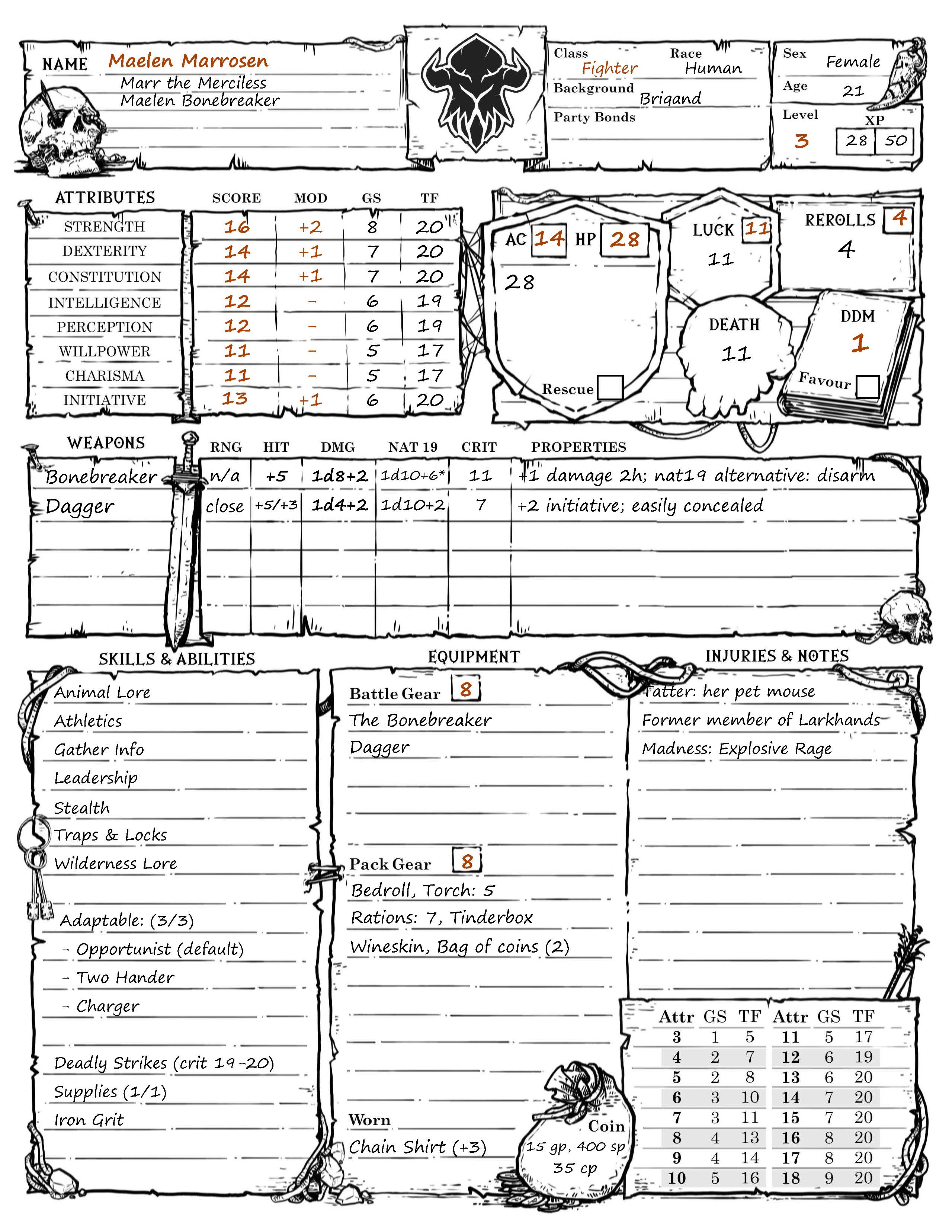 Our fighter has gone through a rough time, almost dying in both adventures so far and gaining a madness she’ll need to wrestle with in Downtime. Fortunately, she gets some sweet advances at Level 3. Her Strength is already 16, so it’s not obvious where to place her Attribute bonus. For me, the choice is between Constitution (which gives her more hit points) or Willpower (which helps her recover hit points faster). I’ll let the narrative decide here… if anything, I think Maelen is less hardy than before, having been beaten down repeatedly. But her Willpower is stronger than ever, and she’s found new reserves she didn’t know existed. It increases from 11 to 12. That said, her Hit Points do get a boost, from 20 maximum to 23. Her Attack Bonus moves from +2 to +3, and Maelen now also has 4 Rerolls available, plus 3 uses of Adaptable.