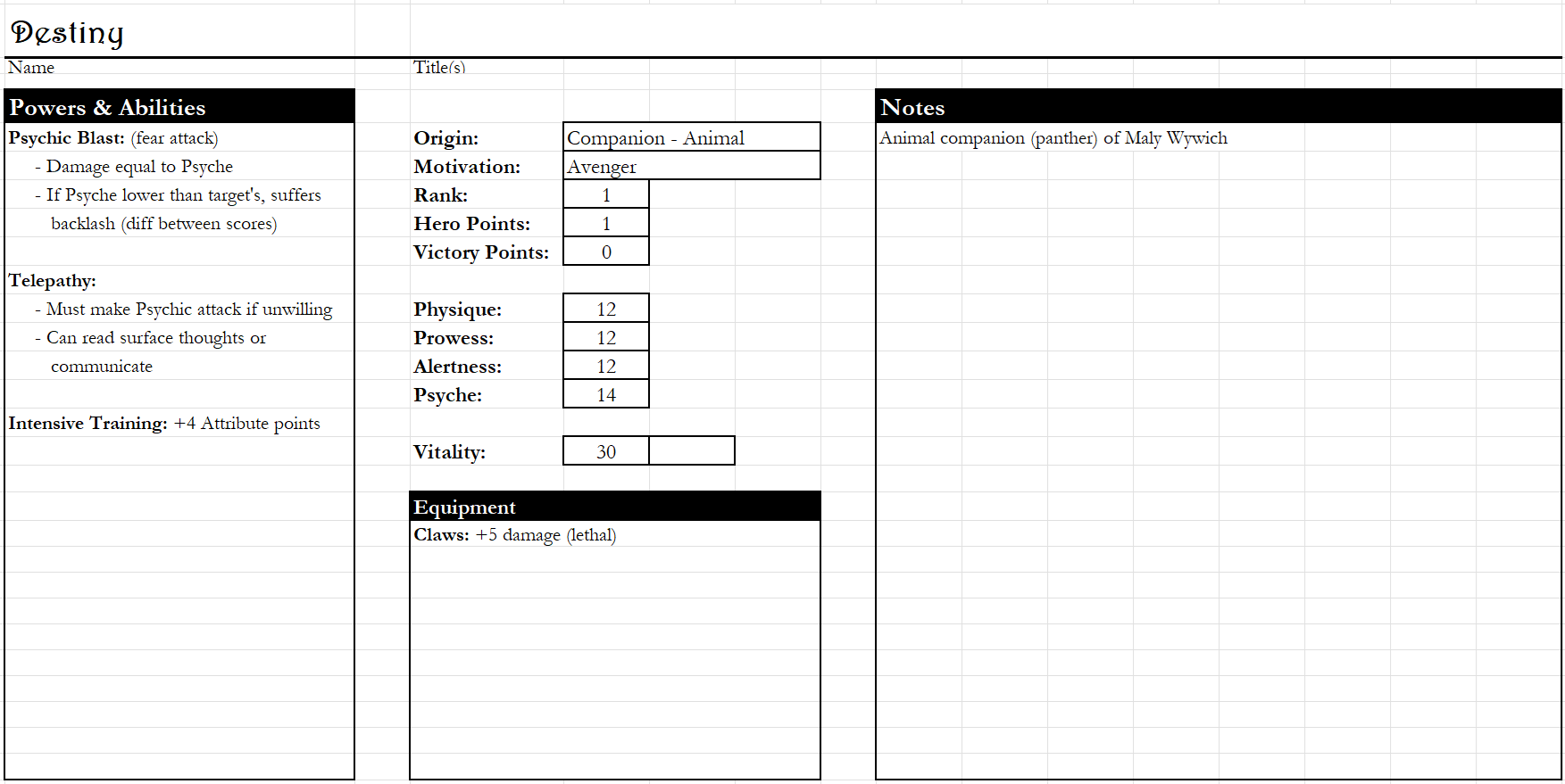 I don’t have enough Attribute points to make the panther as bad ass as I picture in my mind, so I’ll have to justify it as a relatively small version who will grow as his and Maly’s Rank grows. For now, I’ll put five points in Psyche and distribute the remaining nine points evenly among the other stats. With a 12 Physique, our animal companion panther will have a Vitality of 26.