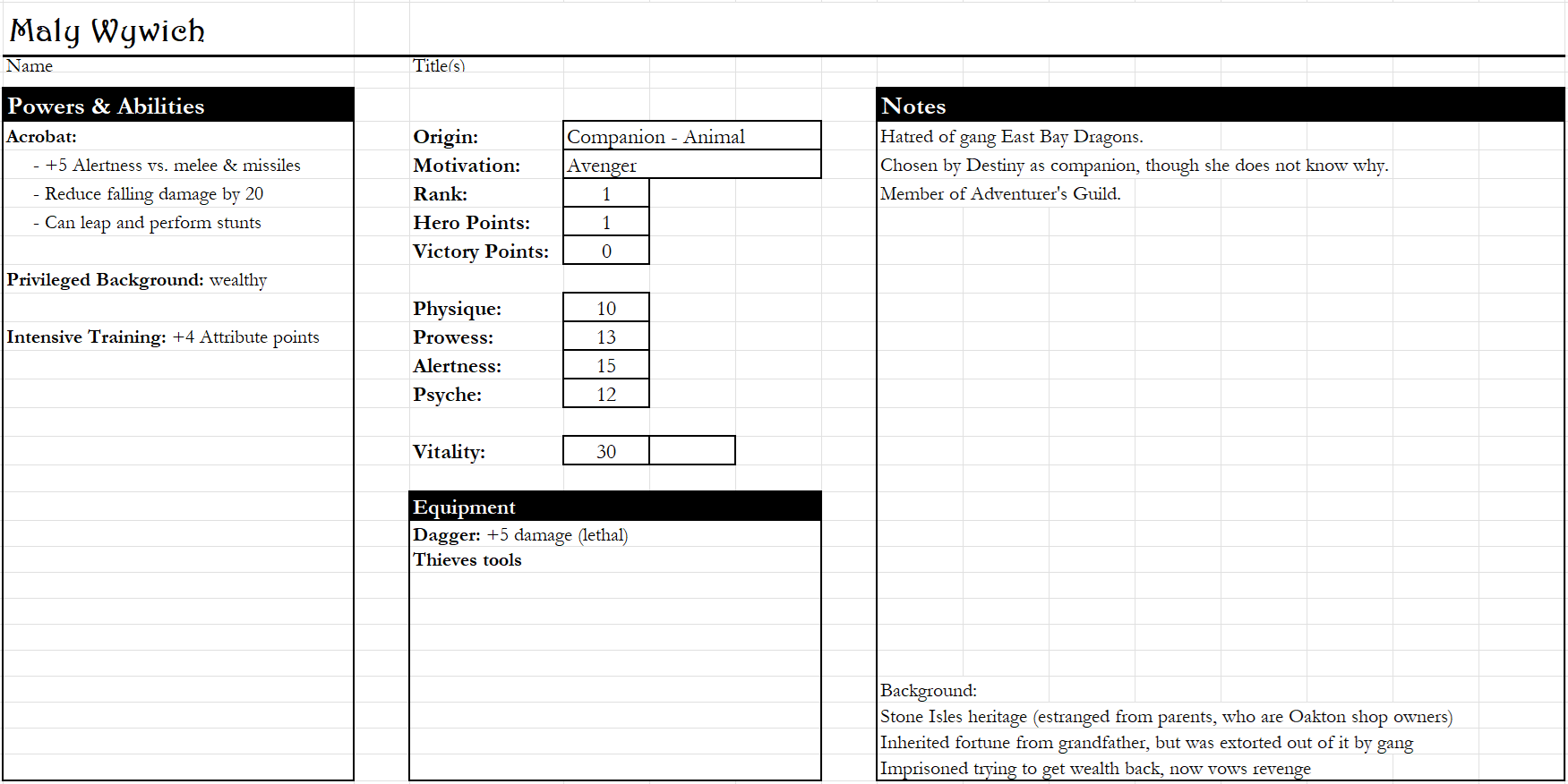 Maly’s motivation is front of mind for me. She’s an Avenger, sworn to reclaim her inheritance and, more importantly in her mind, punish the Oakton gang responsible (I’ll have to flesh out that gang at some point). To keep things simple, I’ll say that her panther—whose name I’ve decided is Destiny—chose Maly precisely because of this motivation because he is himself a spirit of vengeance. What Destiny the panther wants to avenge, I have no idea but will figure out over time.