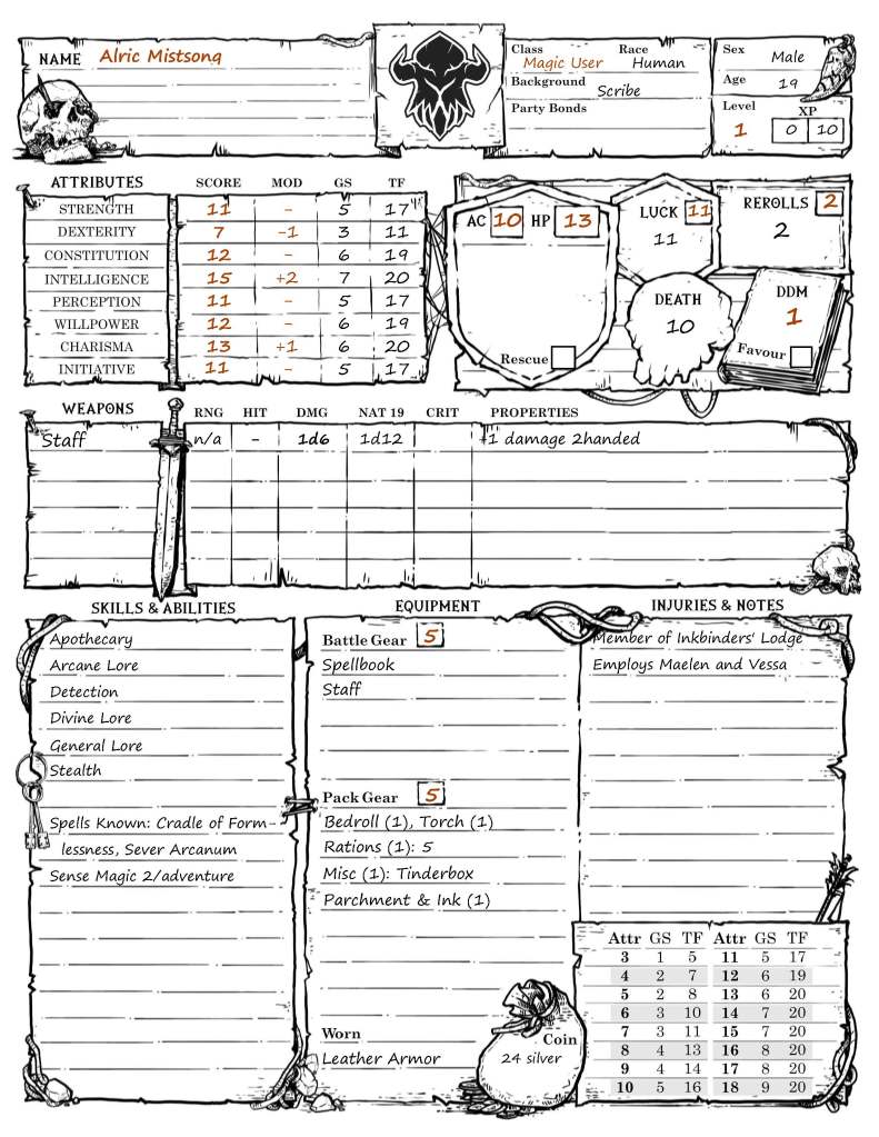 His Luck, Rerolls, and DDM are the same as Vessa (11, 2, 1). His Death Save is 10, also the same. His Initiative is a nice, average 11. He has an impressive (for a Magic User) 13 Hit Points.
