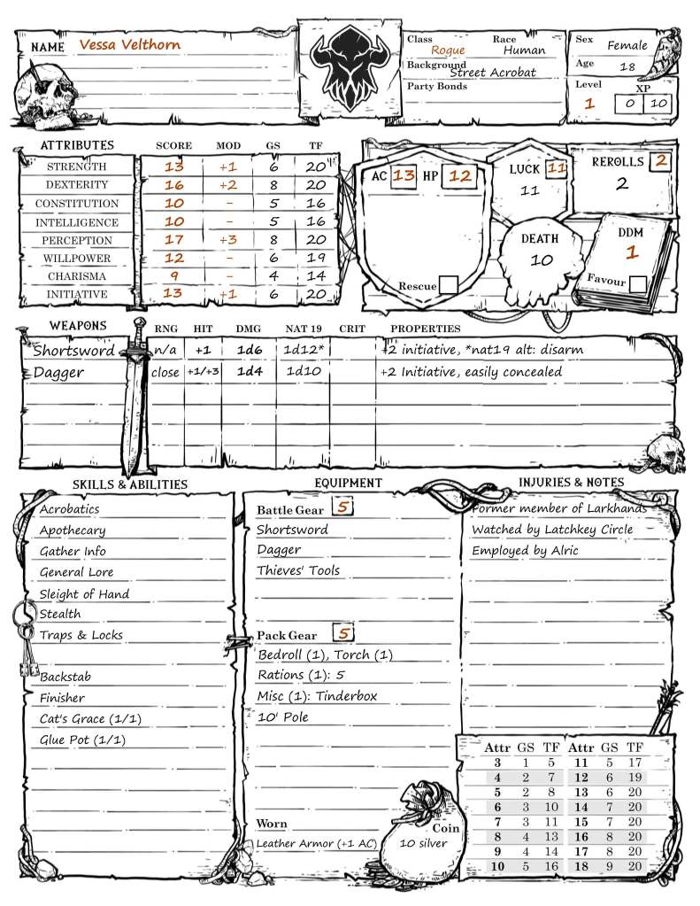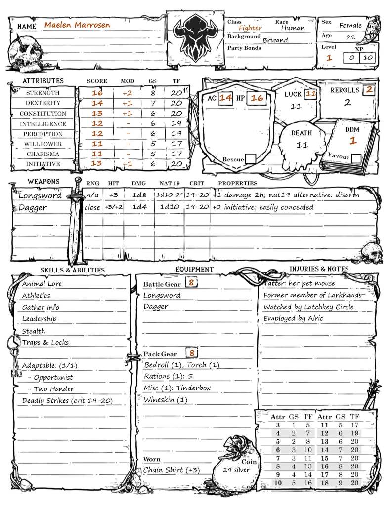 Once again, Luck, Rerolls, and DDM are 11, 2, and 1. Her Initiative is a respectable 13. Thanks to her Class, her Hit Points are a more-than-respectable 16. Her Death Save is 11.