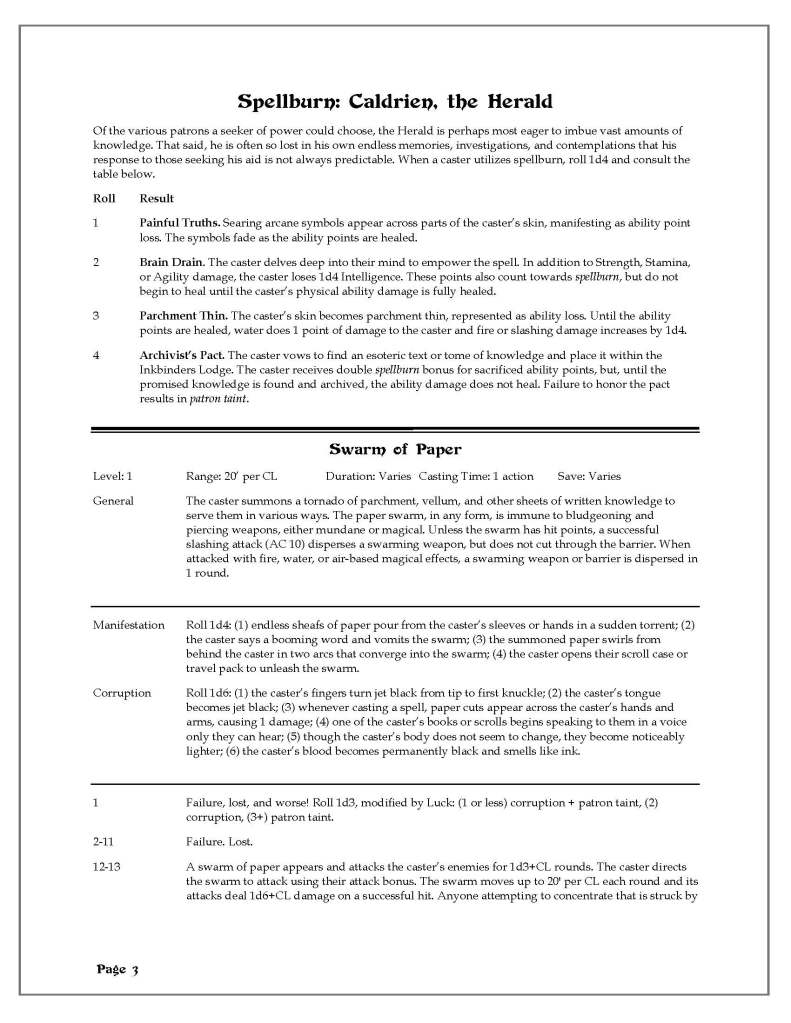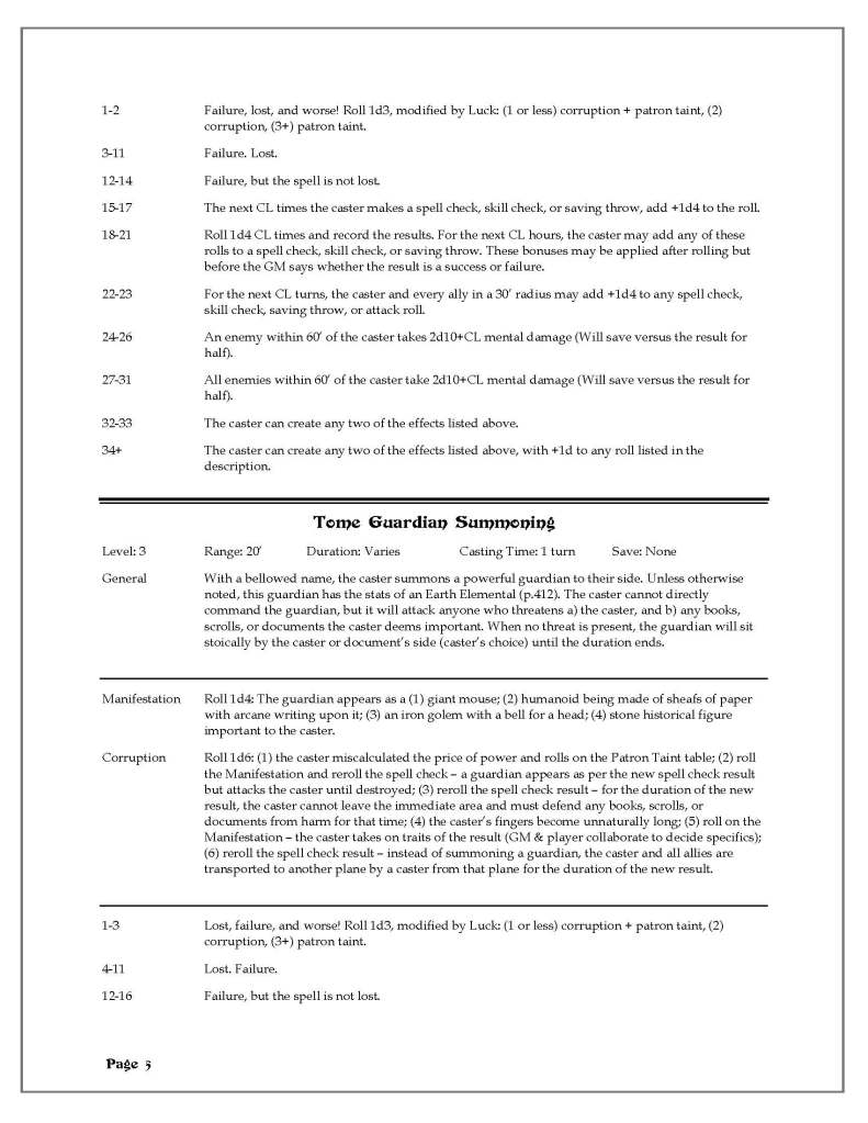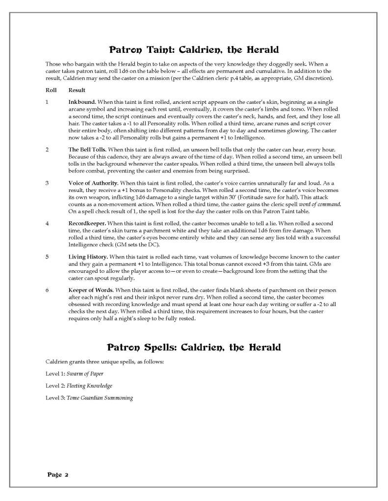 Whereas I struggled to find DCC deities of knowledge and libraries for the Deity entry, I was thrilled for this Patron write-up to find Amarais, caretaker of the Eternal Library, from the recent Angels, Daemons, & Beings Between, Volume III: Macabre Minds from the excellent folks at Shinobi 27 Games. Caldrien’s spellburn table was heavily influenced by Amarais, and I directly stole Swarm of Paper as a level 1 spell directly. Even the idea of summoning a Tome Guardian came from Amarais (though the mechanics are quite different for Caldrien). Which is all to say, if you love DCC, you should absolutely own all three volumes of these books!