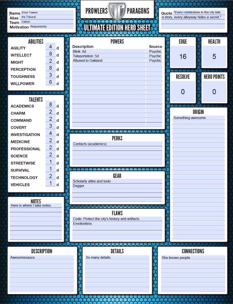 I’d like to make Motivations matter more in my game, either by adding Victory Points (the Crusaders equivalent of xp) or Hero Points (the metacurrency that allows PCs to flip-flop die rolls) when characters are acting in direct accordance with their motivation or achieve some story milestone. Possibly both, though I’m leaning towards Hero Points. It’s something I’ll watch once I’m playing and getting a better feel for the system.