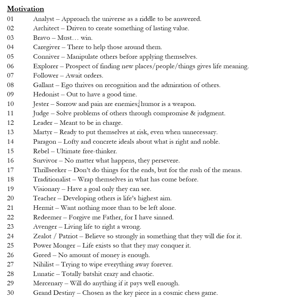 In the meantime, long ago I created a handy Motivations list for my various characters, both in TTRPGs and writing fiction. The inspiration for this list originally came from an excellent list in the first edition of the Aberrant rpg, and I slowly added to it over time. My thought is that any character, protagonist or antagonist, can have one of these motivations.